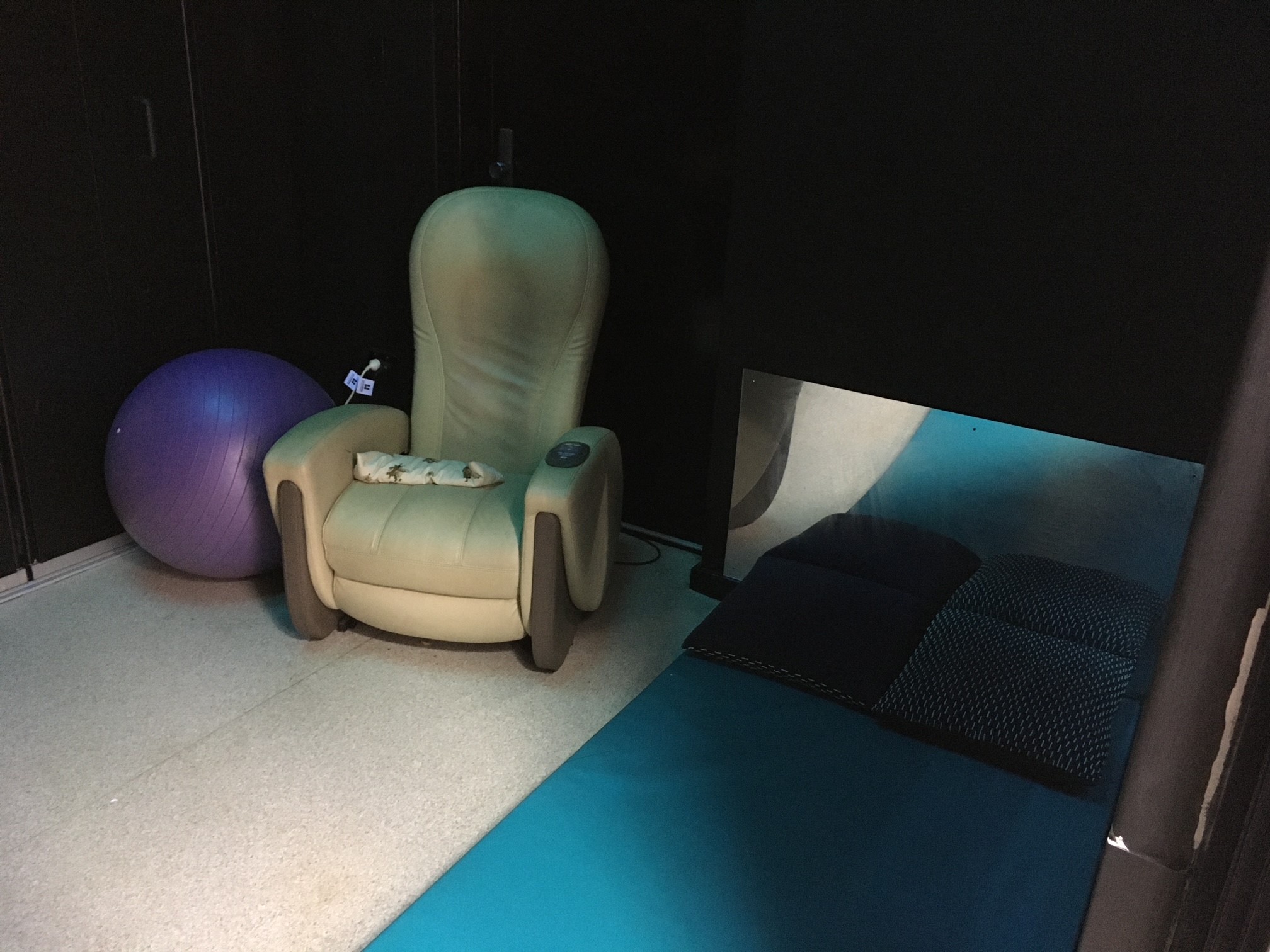 The secondary campus room has a massage chair, weighted blankets, cushions and a activity wall.